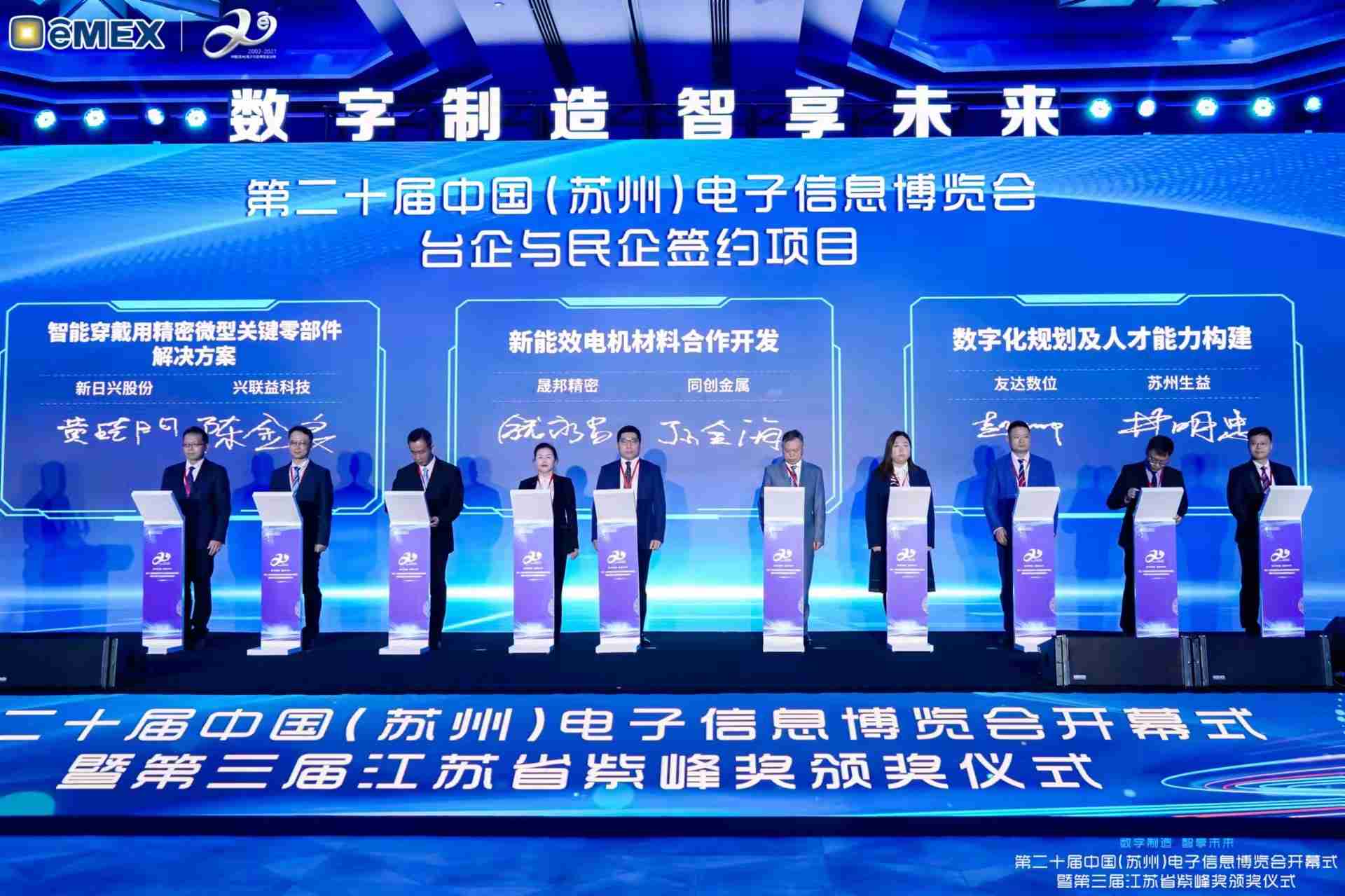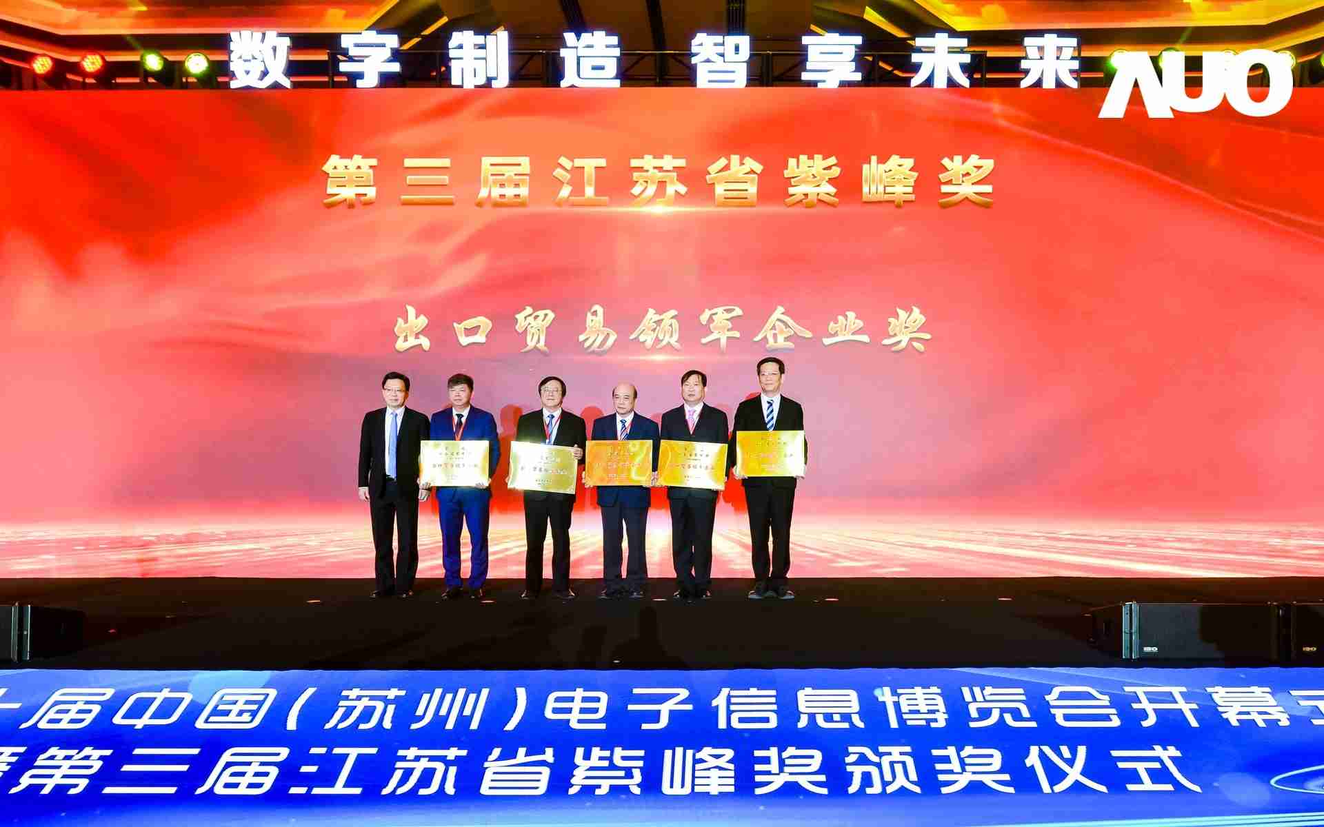 电博会开幕式当天也是第三届江苏省紫峰奖颁奖仪式,,,,省台办、、、、工信厅、、、商务厅、、苏州市相关领导均出席并颁奖。。。。该奖项为表彰对江苏高质量发展做出积极贡献的在苏企业,,,,由江苏省政府专门设立。。。2468BET光电 (苏州) 总经理郭振明代表上台领奖,,,这也是2468BET苏州连续三次蝉联紫峰奖 出口贸易领军企业奖。。。。2468BET数位总经理赵丽娜女士,,也参与本次开幕式,,,上台为本地化赋能签署战略合作协议,,,将优质服务资源集合、、、下沉到更多细分行业,,为更多地区的制造企业提供数字化转型服务。。。。