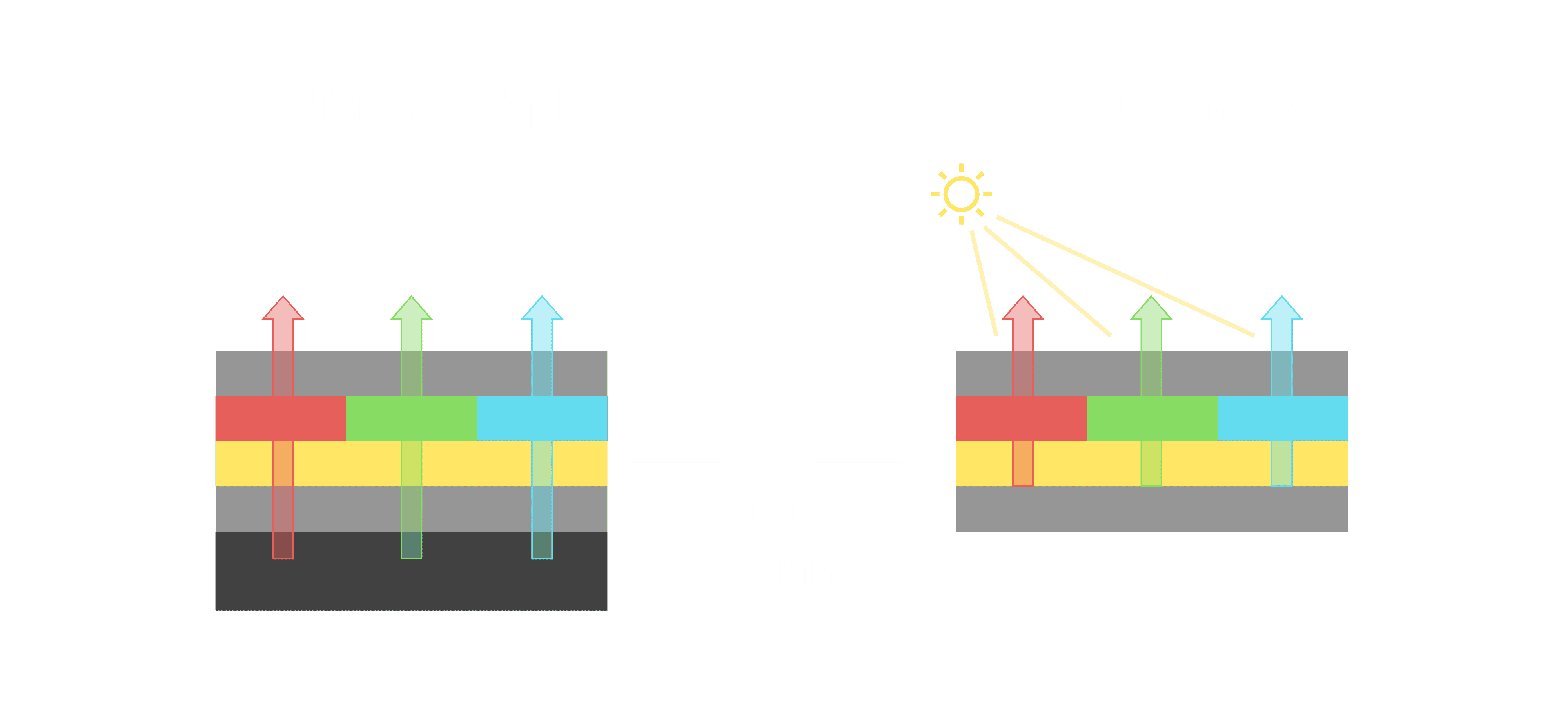 与传统需搭配背光单元的液晶显示相比,,反射式液晶技术不仅更省电、、、更轻薄,,,且即便在艳阳下仍能清晰显示。。。此外,,少了背光单元,,也大幅降低了 LED 蓝光伤害眼睛的疑虑。。。。